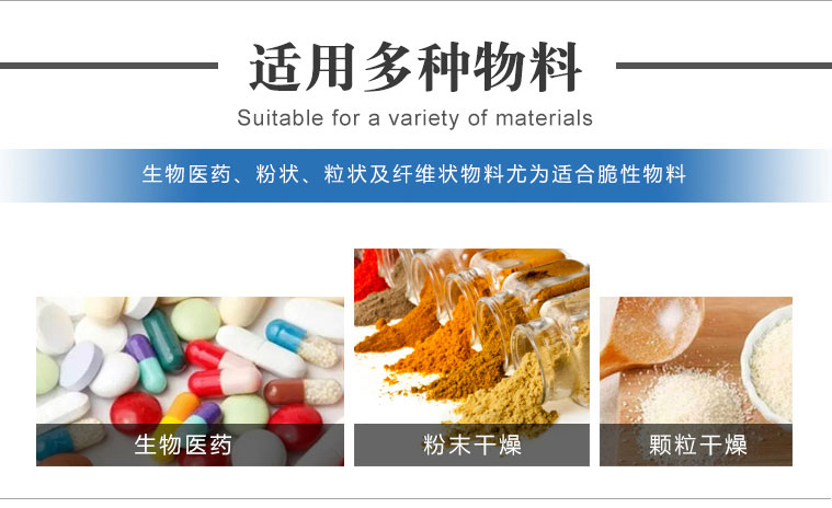 適用化工、制藥、食品等行業(yè)的粉狀、粒狀及纖維的濃縮、混合、干燥及需低溫干燥的物料(如生化制品等更適用于易氧化、易揮發(fā)、熱敏性、強(qiáng)烈刺激、有毒性物料和不允許破壞結(jié)晶體的物料的干燥。